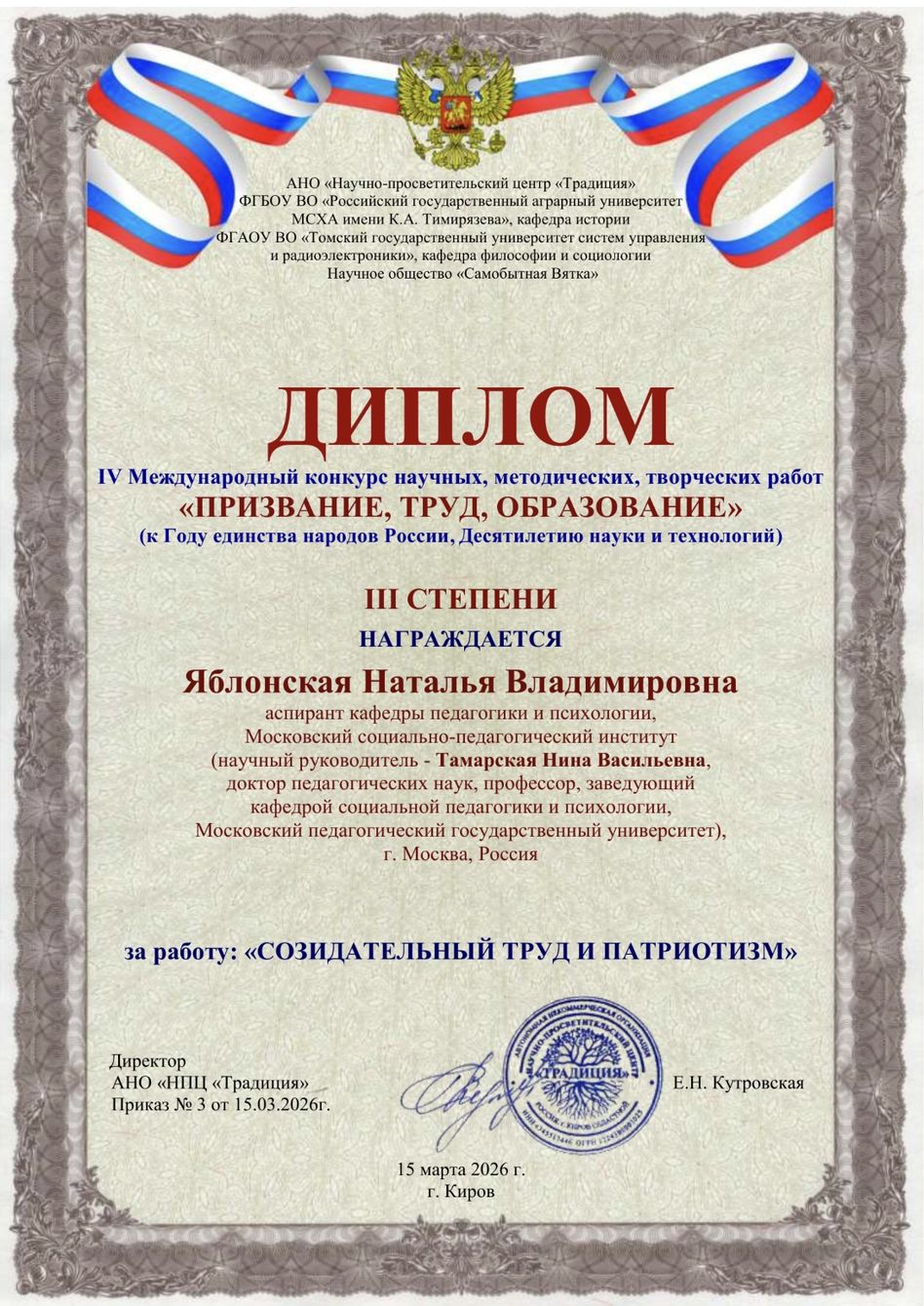 15 марта 2026 года были подведены итоги IV Международного конкурса научных, методических, творческих работ «Призвание, труд, образование», посвящённого Году единства народов России, Десятилетию науки и технологий. Организаторами конкурса выступили АНО «Научно-просветительский центр «Традиция»; ФГБОУ ВО «Российский государственный аграрный университет – МСХА имени К.А. Тимирязева»; ФГАОУ ВО «Томский государственный университет систем управления и радиоэлектроники»; Научное общество «Самобытная Вятка». На конкурс было представлено более 400 работ по 33 тематическим направлениям.