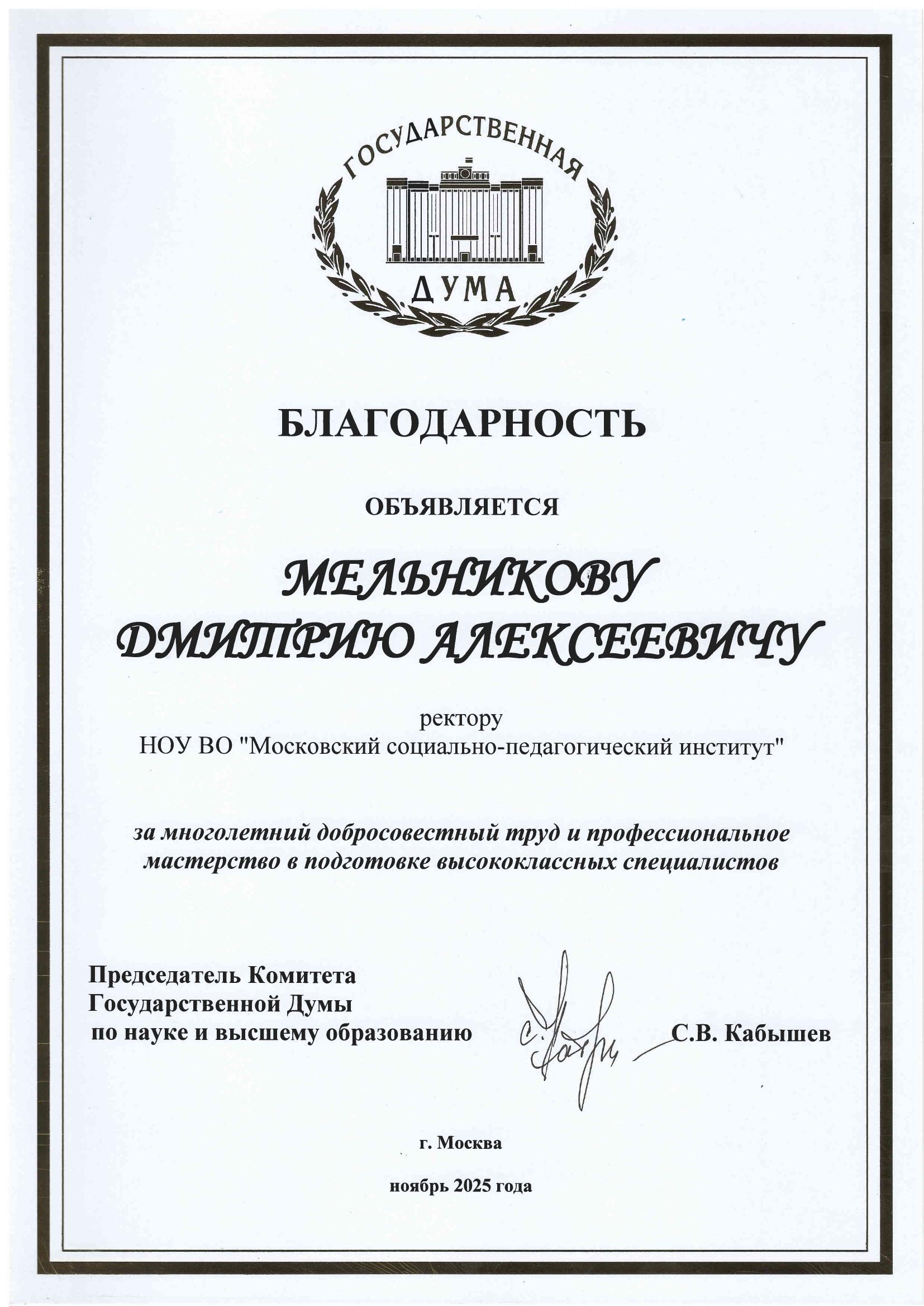 Благодарность ректору МСПИ Д.А. Мельникову от Комитета Государственной Думы по науке и высшему образованию