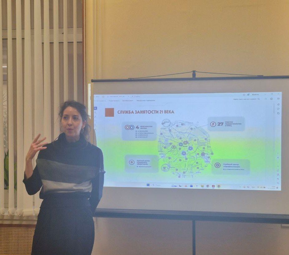 Открыла встречу Н.И. Анфимова, главный специалист отдела партнёрских программ для молодёжи, представитель Центра занятости населения. В своей презентации Надежда Игоревна подробно рассказала о широком спектре мероприятий, проводимых Центром занятости, направленных на поддержку молодых специалистов и соискателей. Особое внимание было уделено работе флагманских центров «Моя карьера», которые предоставляют индивидуальные консультации, профориентационные тесты, мастер-классы и тренинги, помогая молодёжи эффективно ориентироваться на рынке труда и строить успешную профессиональную траекторию. Информация оказалась крайне полезной для студентов, находящихся на пороге выбора своего первого рабочего места или планирующих дальнейшее карьерное развитие.