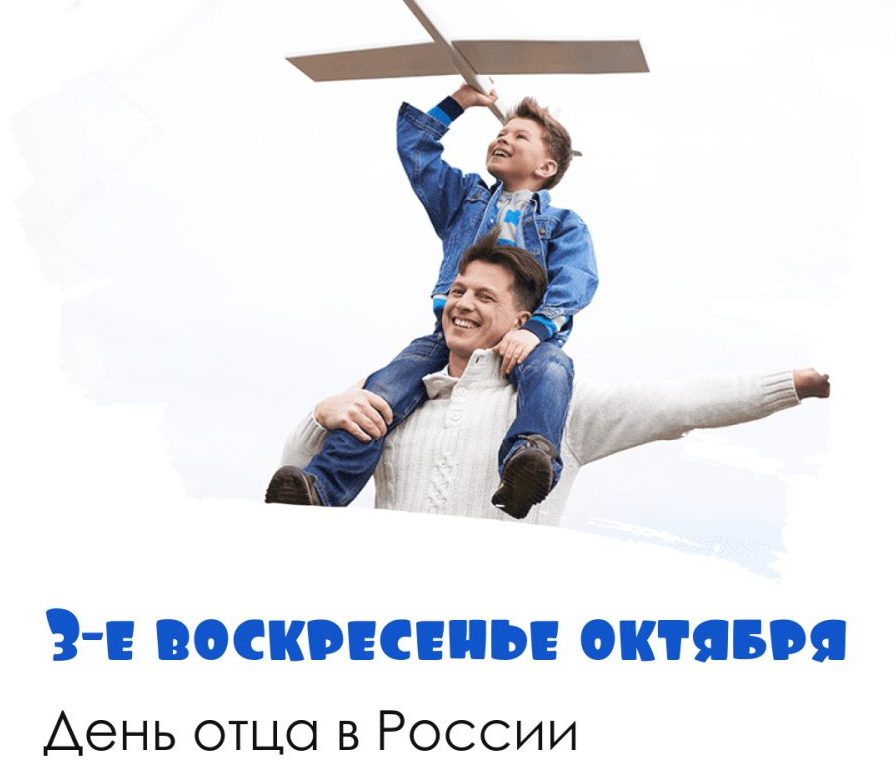 В России, начиная с 2021 года, отмечается семейный праздник – День отца, официально установленный Указом Президента РФ № 573 от 4 октября 2021 года «в целях укрепления института семьи и повышения значимости отцовства в воспитании детей». Дата его празднования – третье воскресенье октября. В 2025 году это 19 октября.