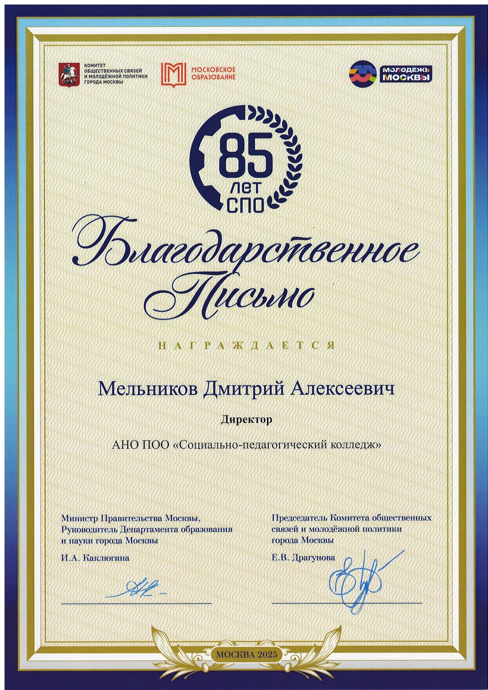 1 октября 2025 года директор Социально-педагогического колледжа Д.А. Мельников по приглашению Председателя Комитета общественных связей и молодёжной политики города Москвы Е.В. Драгуновой принял участие в праздничном мероприятии, приуроченном к 85-летию системы среднего профессионального образования «День СПО 2025».