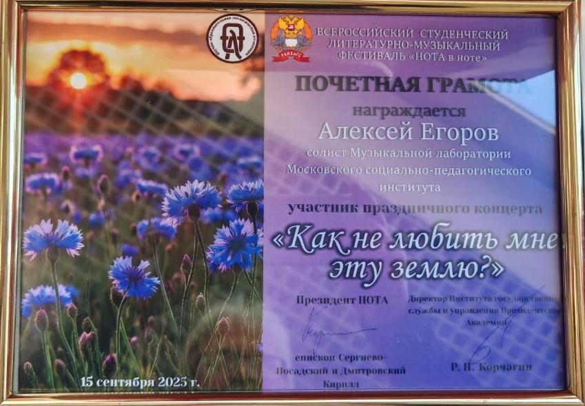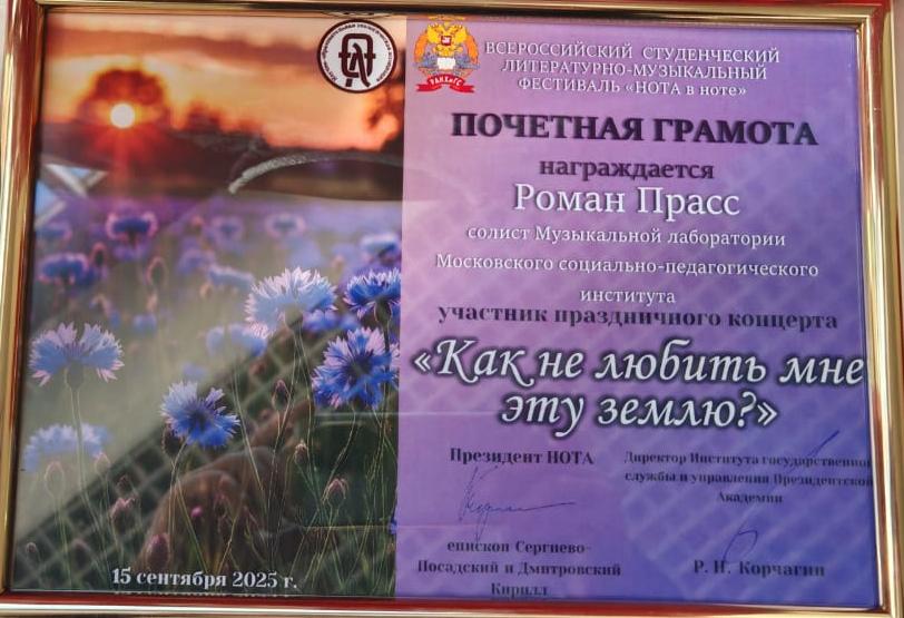 15 сентября 2025 года в Президентской академии состоялся гала-концерт «Как не любить мне эту землю…», приуроченный к открытию образовательного модуля «Основы российской государственности». Концерт прошёл в рамках нового сезона Всероссийского студенческого литературно-музыкального фестиваля «НОТА в ноте». Организатором мероприятий фестиваля традиционно выступает Научно-образовательная теологическая ассоциация (НОТА), объединяющая сегодня уже более 80 университетов и духовных школ России.