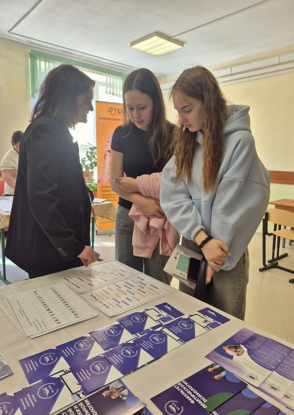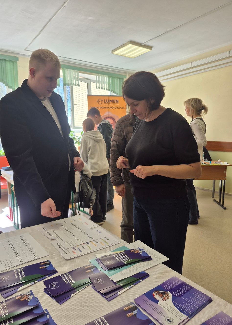 Для учащихся 8-11 классов и их родителей стенд МСПИ и СПК стал настоящим навигатором в мире современных педагогических, социальных и психологических специальностей. Ребята и их родители смогли получить индивидуальные консультации по правилам приёма в институт и колледж у ответственного секретаря приёмной комиссии Е.И. Брагиной, а также принять участие в мастер-классе по нейрогимнастике, которую для всех желающих провели студенты вуза Вайсман Полина и Пименов Михаил.