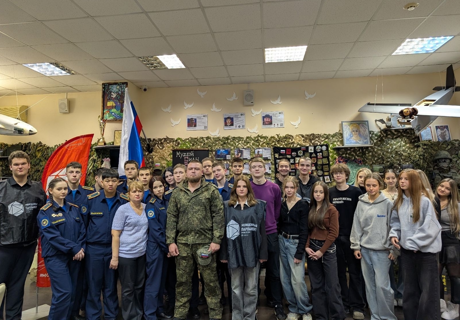 Особым моментом встречи стало знакомство с образцами современного вооружения и инвентаря, используемых на СВО. Экспонаты, привезённые с линии боевых действий, представлены в рамках выставки «Муzей Силы. Веры. Отваги». Часть из них лично передал боец Калаш. В ходе экскурсии по экспозиции участник СВО подробно комментировал представленные экспонаты: элементы экипировки, обломки беспилотников, средства связи и навигации, а также личные вещи солдат. Он делился своим бесценным опытом их применения в полевых условиях, делая рассказ максимально наглядным и запоминающимся.