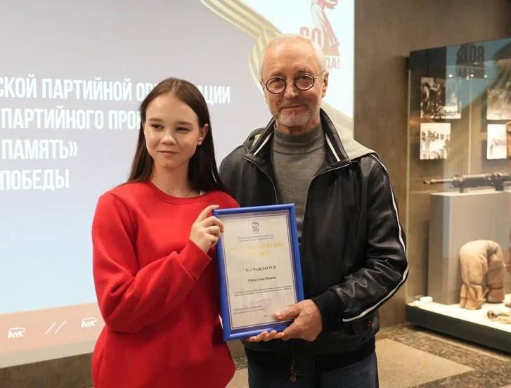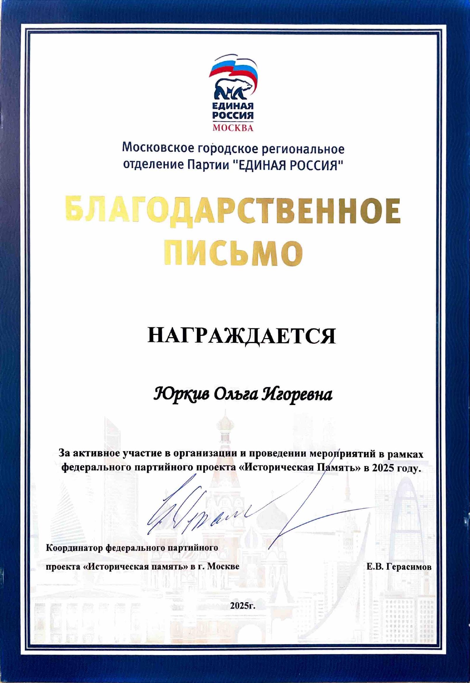 5 сентября 2025 года в музее Победы прошло торжественное награждение, в рамках которого студентка 3 курса факультета коррекционной педагогики и специальной психологии МСПИ Ольга Юркив получила благодарственное письмо за активное участие в организации и проведении мероприятий в рамках федерального партийного проекта «Историческая Память» в 2025 году. Награду вручил депутат Московской городской Думы, народный артист Российской Федерации и координатор федерального партийного проекта «Историческая память» Е.В. Герасимов.