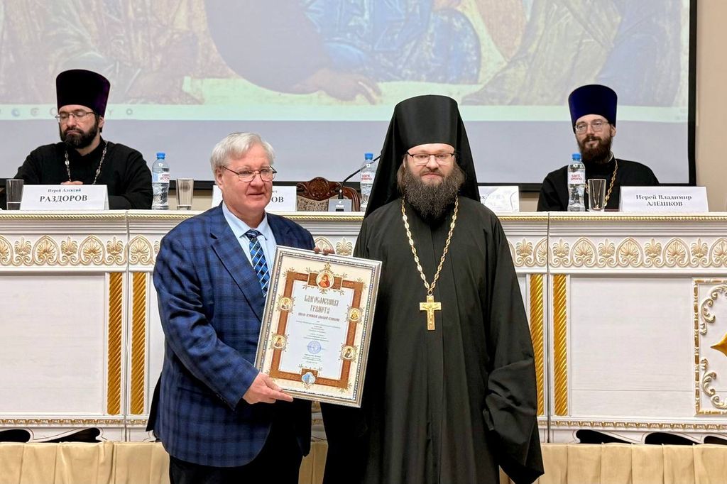 По окончании официальной части и.о. ректора семинарии иеромонах Лука (Пронских) вручил награду ректору Московского социально-педагогического института профессору Д.А. Мельникову в связи с 65-летием и в благодарность за вклад в развитие духовного образования, а также преподавателям и сотрудникам семинарии.